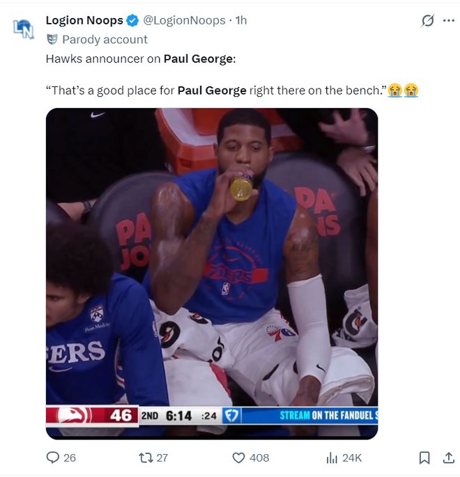 虽然这场比赛乔治还是被老鹰的直播员嘲讽:坐在板凳席感觉才更适合乔治。可此役乔治拿到全场最高的35分,老鹰得分最高的丹尼尔斯是27分10篮板3助攻。