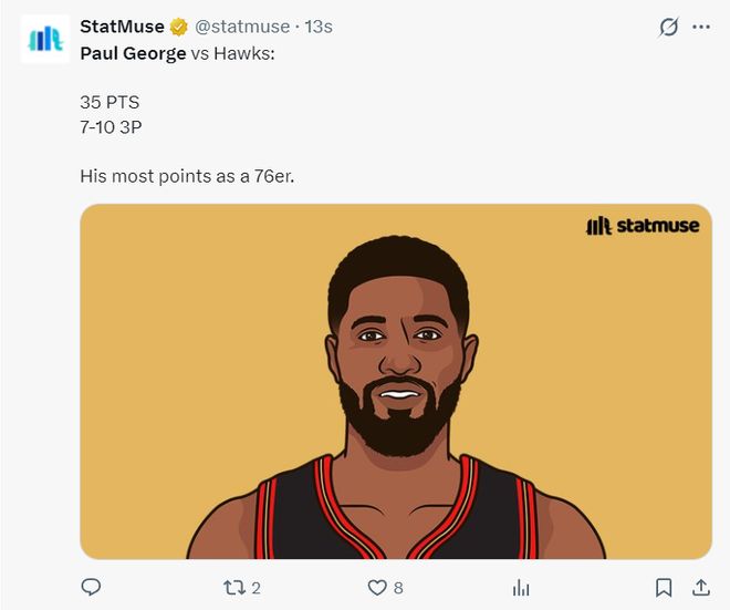 乔治在费城这两个赛季35分还是第一次,所以此役是他费城单场得分新高,也算是费城生涯的最强一战。