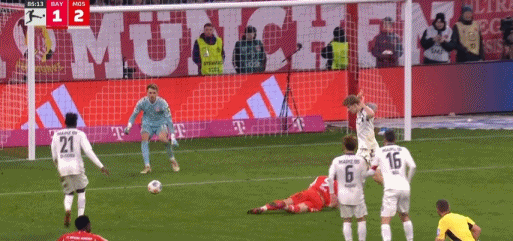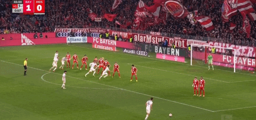 第45+2分钟,伯温开出任意球,波图尔斯基头球破门,美因茨1-1拜仁